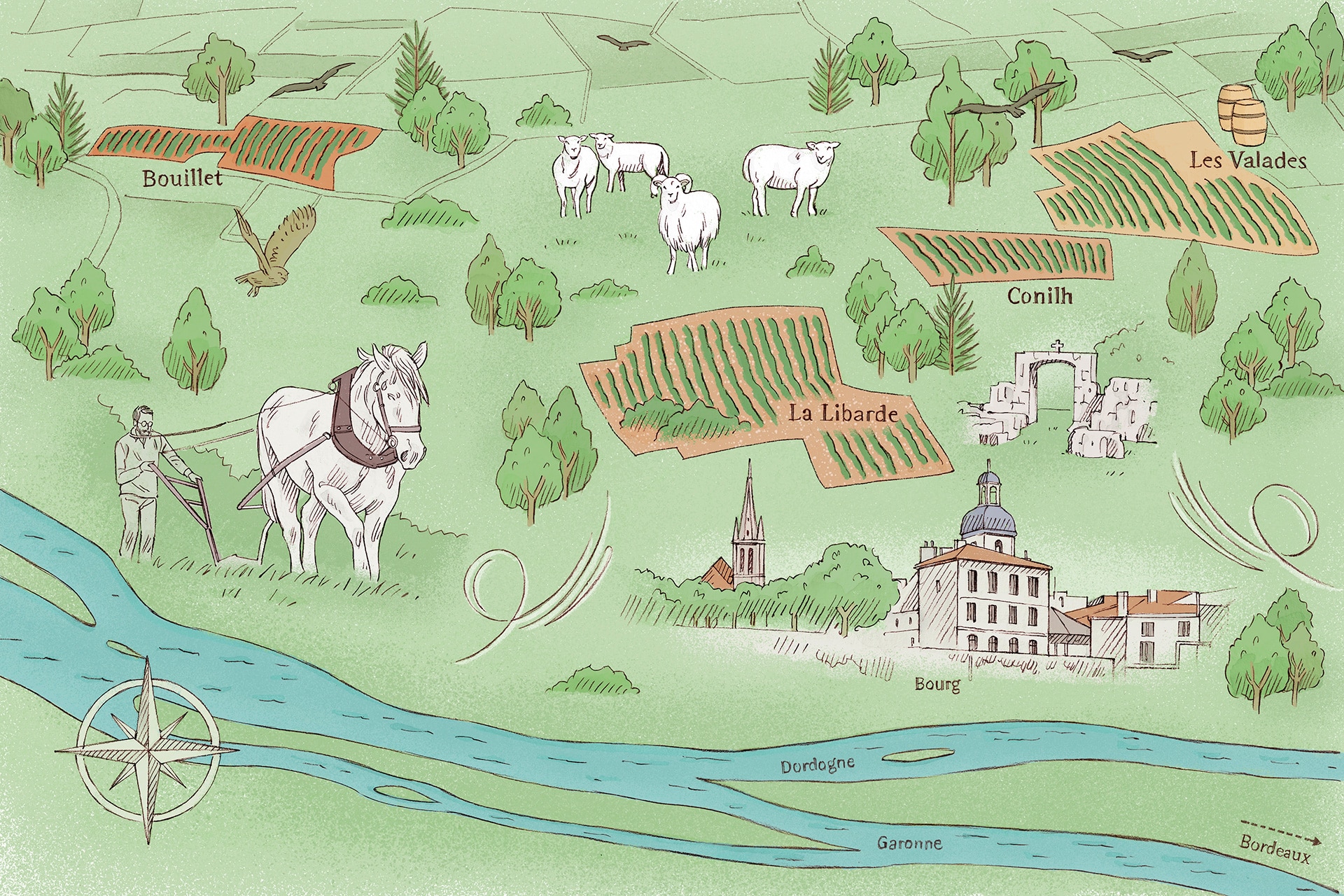 Installés sur les coteaux de Bourg-sur-Gironde, nous célébrons un patrimoine viticole inscrit dans la richesse et la diversité de micro-terroirs — calcaires, argilo-calcaire, graves rouges — et sur des parcelles sélectionnées pour leur diversité et leur potentiel. Ici, pas de monoculture : parmi les 14 hectares, seule une partie de 5 hectares est dédiée à la vigne.
